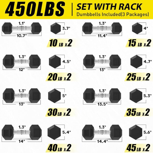 - SET INCLUDES – A pair of 5-pound, 10-pound, 15-pound, 20-pound, and 25-pound rubber dumbbells with a black Two Tier dumbbell rack to store the weights. E-commerce packaging. This set ships in multiple boxes.